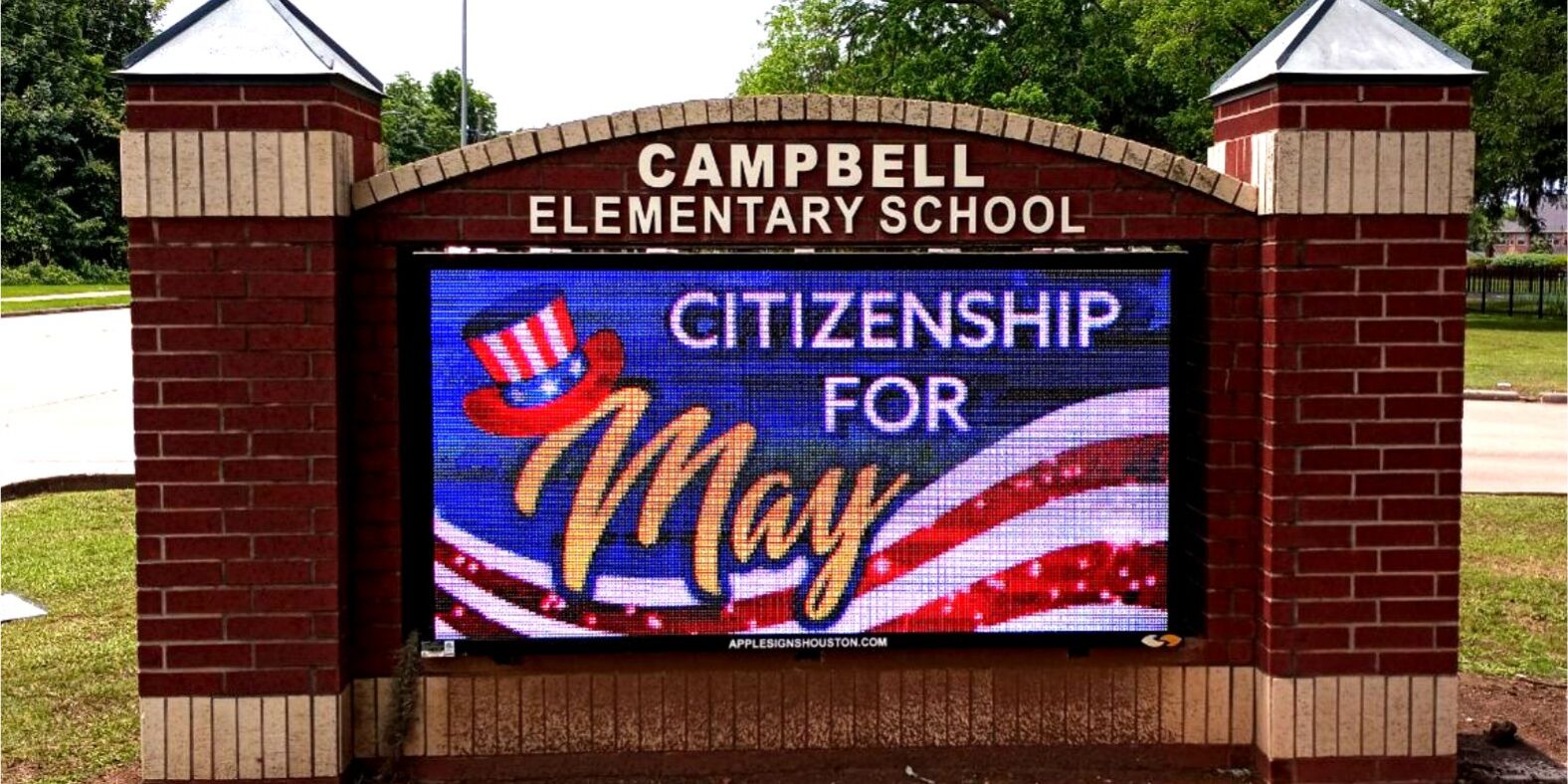 This Sugar Land school, in the Lamar CISD, started off with a bang. When they opened in 2000, they achieved Exemplary Status in its first year of operation and the school has been aiming high ever since. Their monument ID sign gave them two decades of service with its manually operated reader board supplying notice of current events, but it was time for an upgrade. When they asked Apple Signs for the best solution, we suggested the LED message boards with 10mm resolution to give the highest image quality for both their text and graphics.