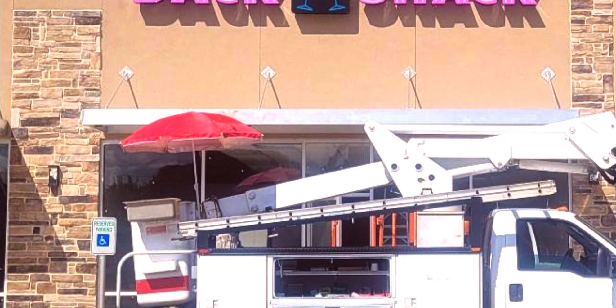 West Columbia is the site for the Dack Shack, near the intersection of Hwy. 35 and 36. A brand new drinking spot that specializes in daquiris…of course. The owners had an idea of what they wanted when they came to Apple Signs so it didn’t take long for our designer to complete the drawing. The name, in hot pink channel letters, is separated by the logo symbol of the clinking cocktail glasses. The vinyl overlay provides the color for the sign and the look of neon in the sign letters with the LED illumination.