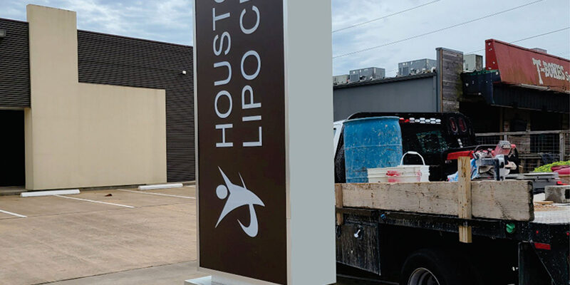 Apple Signs has had a long and successful business relationship with Dr. Bergeron who has built his multi-location, cosmetic surgery practice in Houston. The sign at the T.C. Jester location was beginning to show its age, so the good doctor worked with our graphic designer to come up with a brand new look for this office. The outcome was this clean, vertical design that has an attractive simplicity that is timeless. The sign cabinet and trim has a satin metallic finish and the logo is reversed out in dark bronze. The limestone base ties in with the masonry on the building to complete the appearance profile.