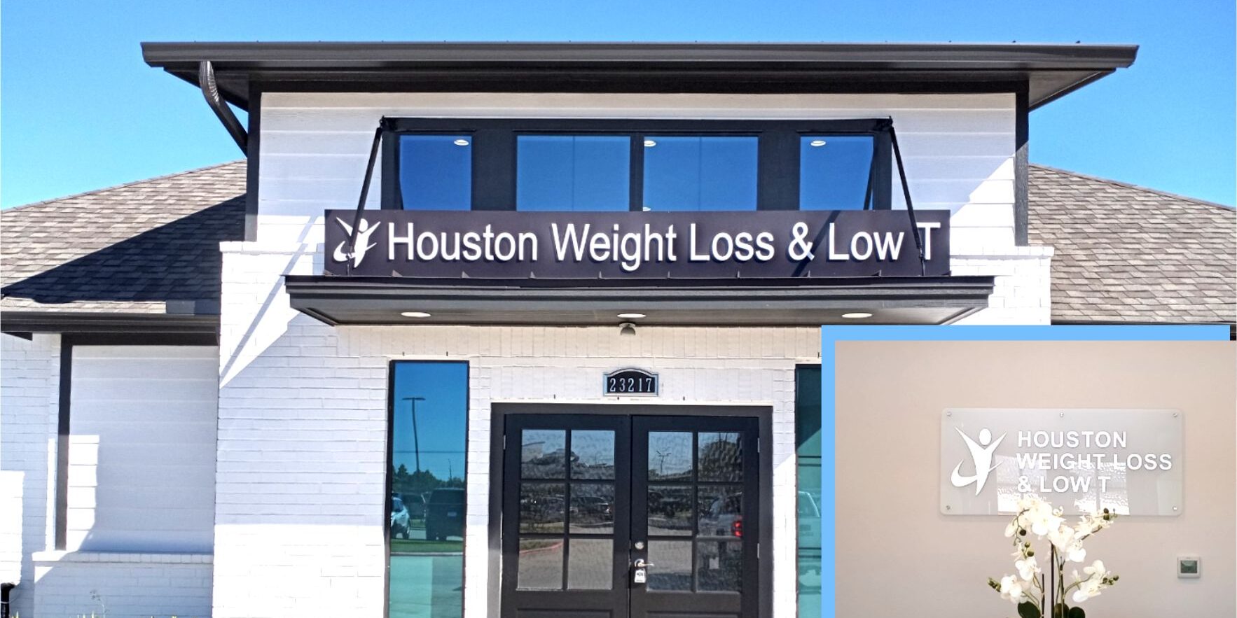 Our long-time customer came back to Apple Signs for the first of several re-branding moves. Dr. Bergeron, who has built a multi-site practice centered on cosmetic surgery, is now adding ‘Low T’ diagnosis and treatment to the mix of services. For the Katy location, we made the main ID sign in the form of this aluminum pan sign that spans the width of the front awning – the sign lettering is done in ½” white acrylic. The interior wall sign repeats the same logo and lettering in brushed aluminum letters. The backer is clear acrylic with an etched glass finish, mounted to the wall with stand-off hardware.