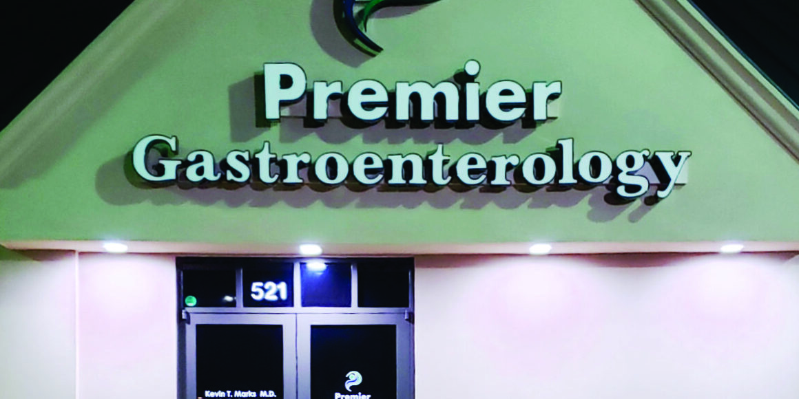Dr. Marks began his career in health care with a BS in Pharmacy in 1991 and continued his education to include his MD and various fellowships, culminating in board certification in gastroenterology. For his Katy area practice, he called upon Apple Signs to design, manufacture and install this integrated sign package. On the building, the name was applied in the form of lighted channel letters, topped by the two color logo symbol. For the interior, the logo appears again in cut acrylic letters that are mounted on a brushed copper background which is suspended from the wall by stainless steel, stand-off hardware. The sign letters are faced with silver, brushed aluminum for an unusual contrast. The logo is repeated once more on the door graphics, providing the office hours and website.